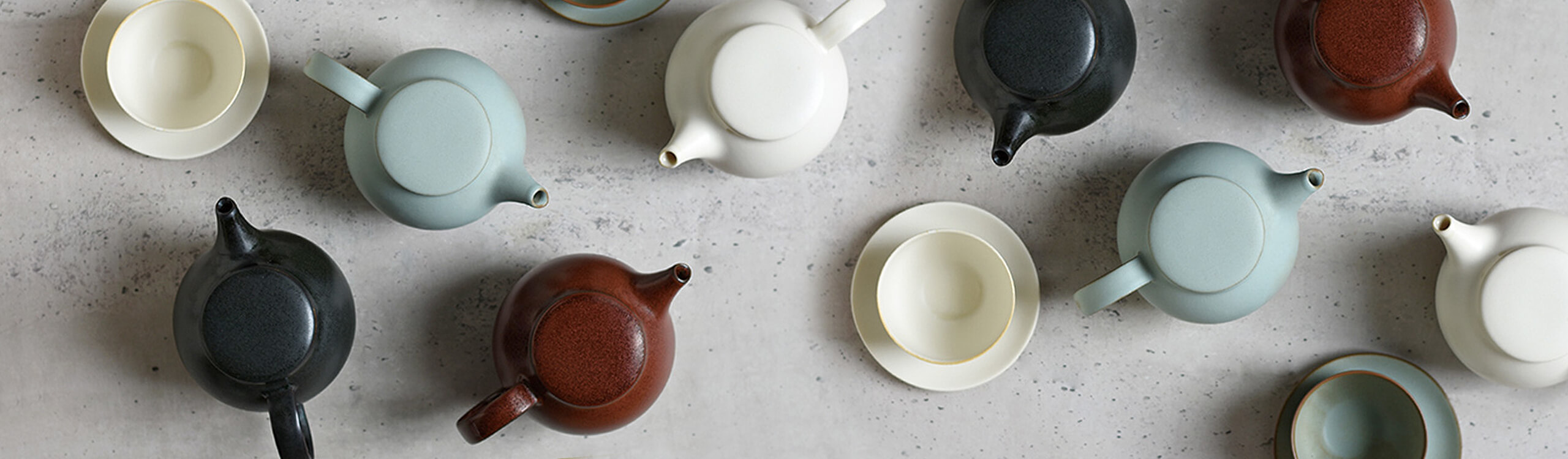 Modern take on the traditional Japanese tea vessel with matching cup and saucer